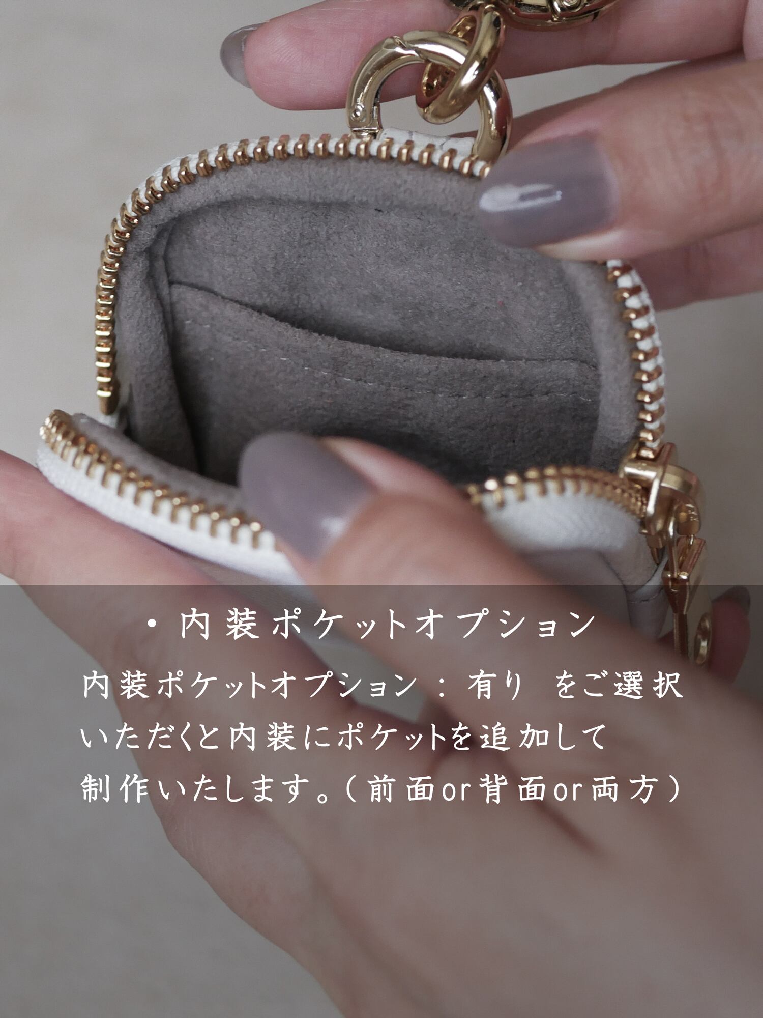 ★オプションで内装ポケットを追加できます。細やかな収納を求める方にも最適です。(Air pods ケースとしての使用が主な場合は、内装ポケットはおすすめしません。Air podsとケースの幅はピッタリサイズですのでポケットに物が入りません。入ってもその内容物の型が外装に浮き出てしまいます。)
