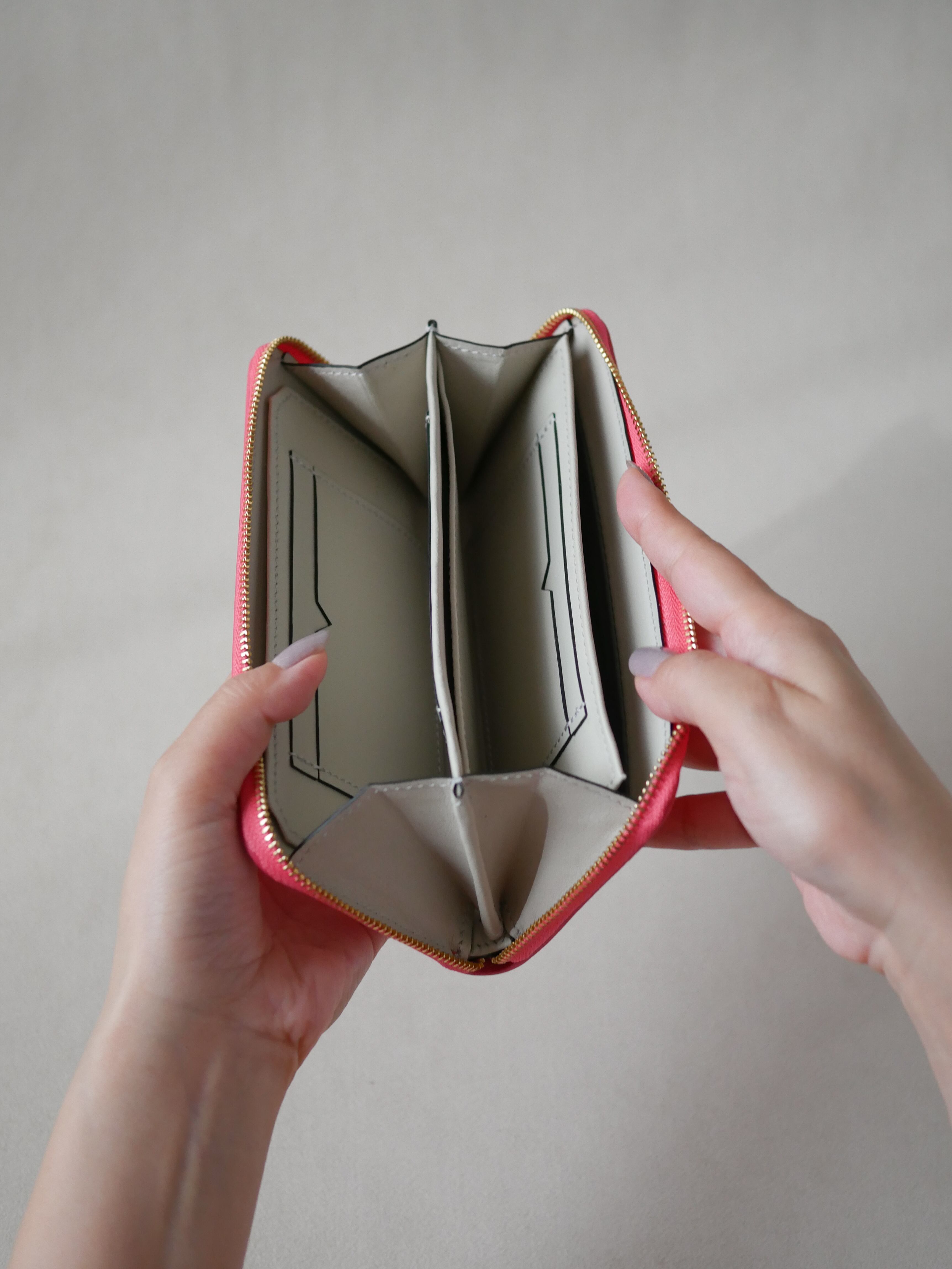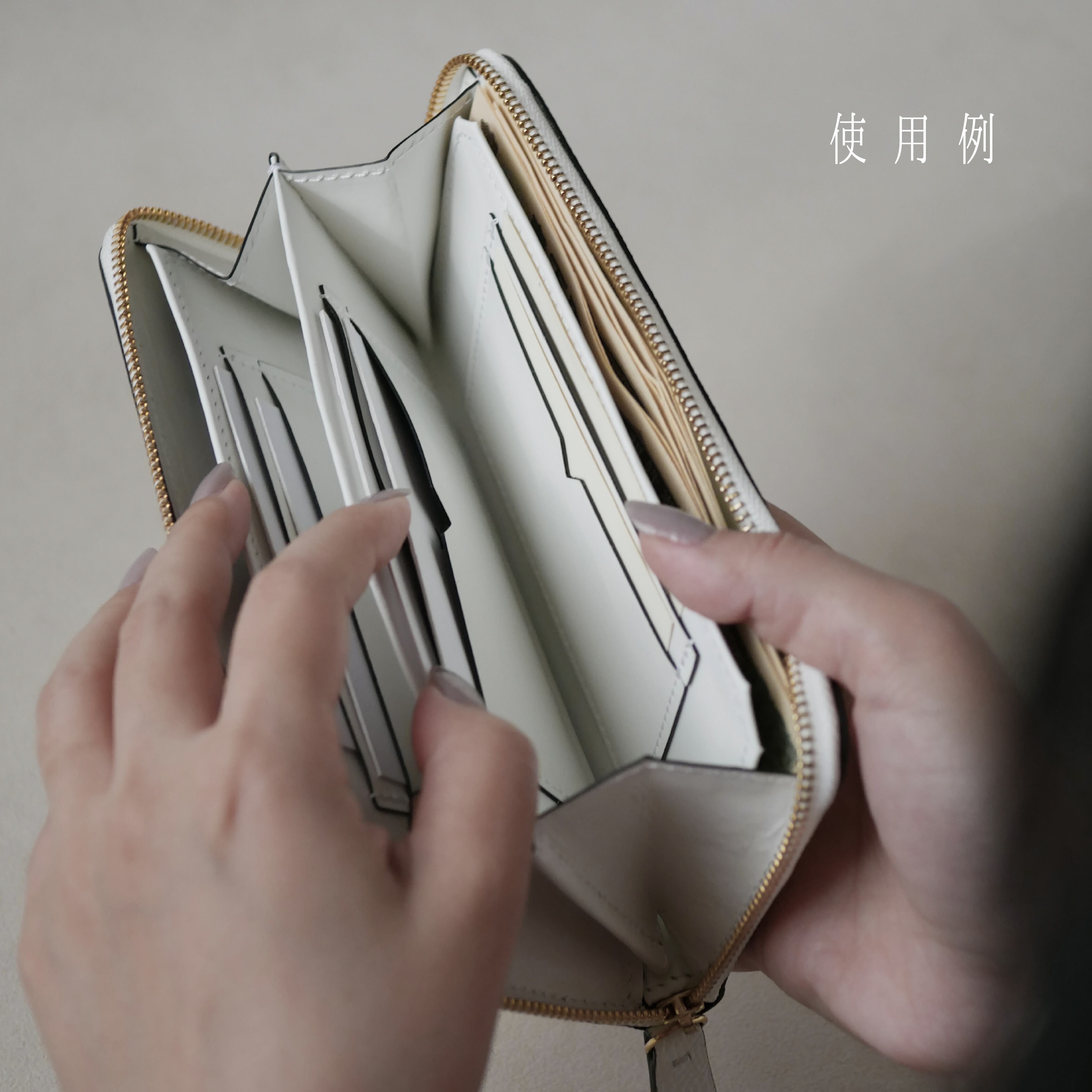 一般的に“小さくする”ことを優先すると内装の美しさがおろそかになりがちですが、本作品は革職人として17年の経験を注ぎ込み、 内装の美しさと使い勝手の良さを両立することにこだわりました。