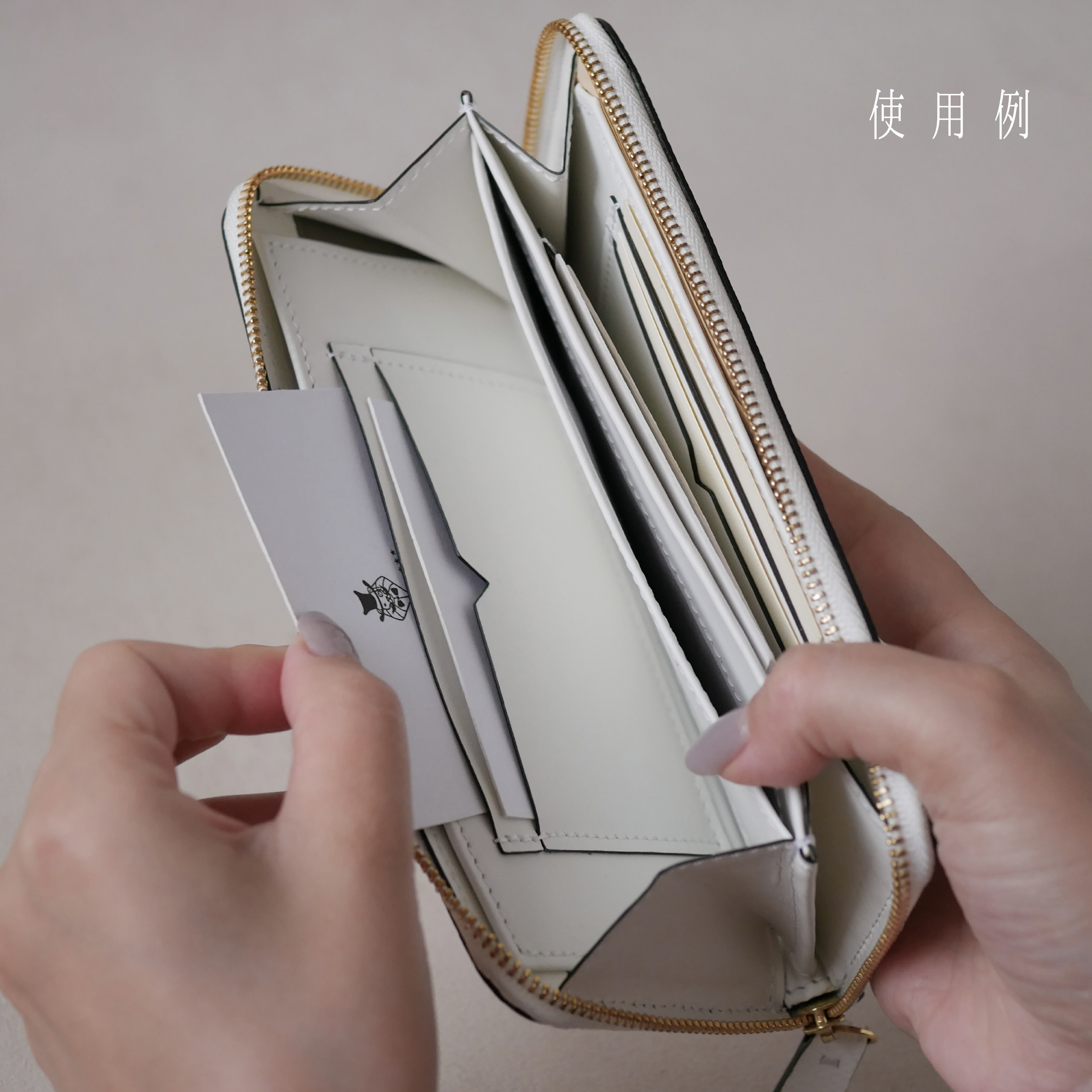 カードポケットは全て「横入れ」に統一。6枚のカードと名刺、レシートまで整然と収まり、開けた瞬間の景色も美しく保たれます。