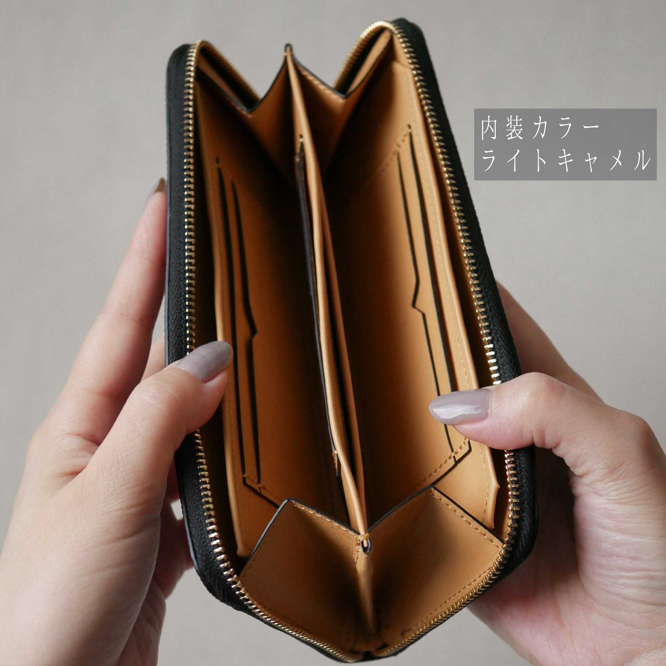 一般的に“小さくする”ことを優先すると内装の美しさがおろそかになりがちですが、本作品は革職人として17年の経験を注ぎ込み、 内装の美しさと使い勝手の良さを両立することにこだわりました。