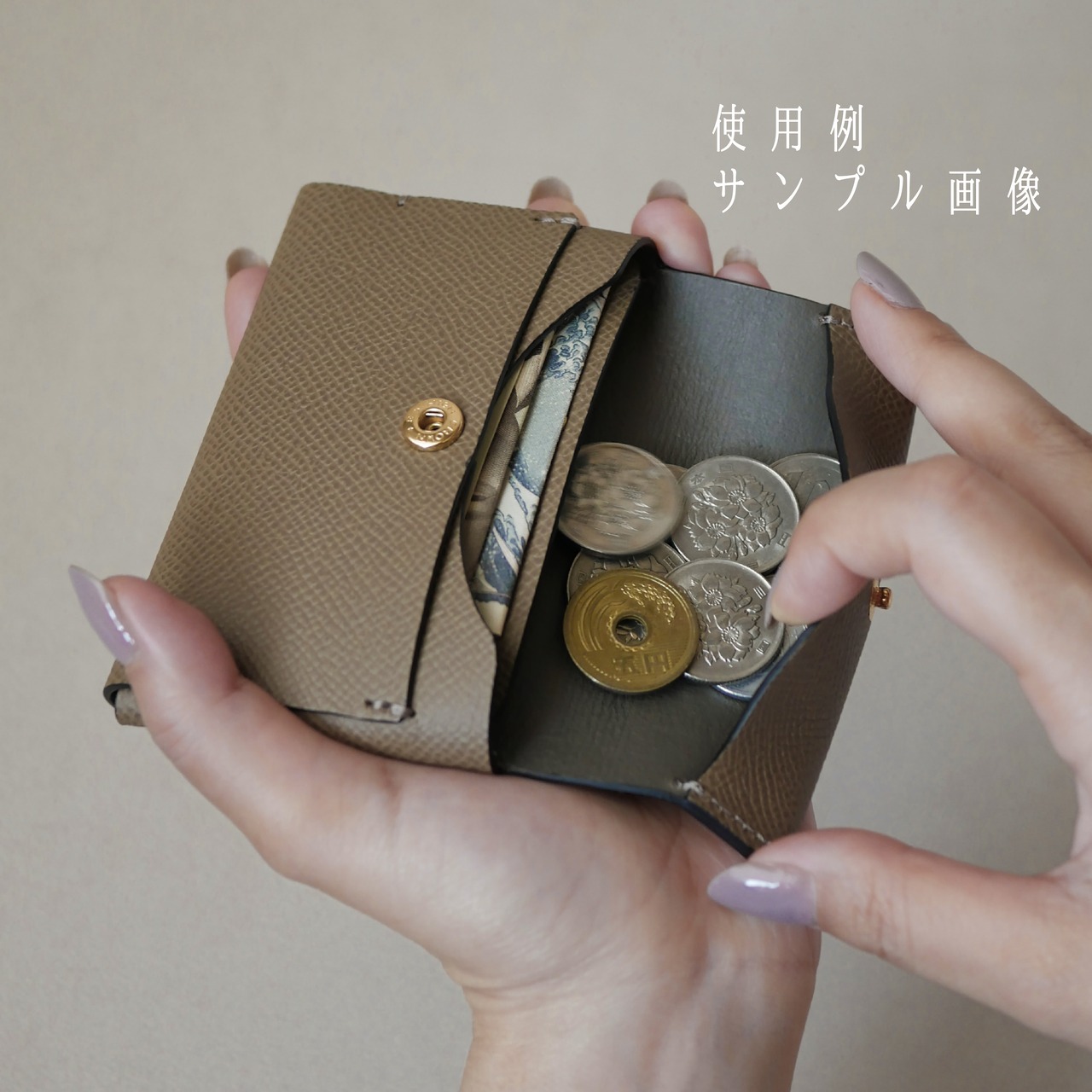 小銭入れは奥側に配置。フタを開くとフタがストッパーとなってトレイ状になり、小銭の取り出しがしやすい構造です。お札は三つ折りにして真ん中スペースに収納可能。