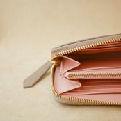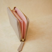 トゥルティエールグレーと、ライトピンクとファスナーのゴールドの金具との組み合わせがシンプルながら上品でかわいらしい配色です。